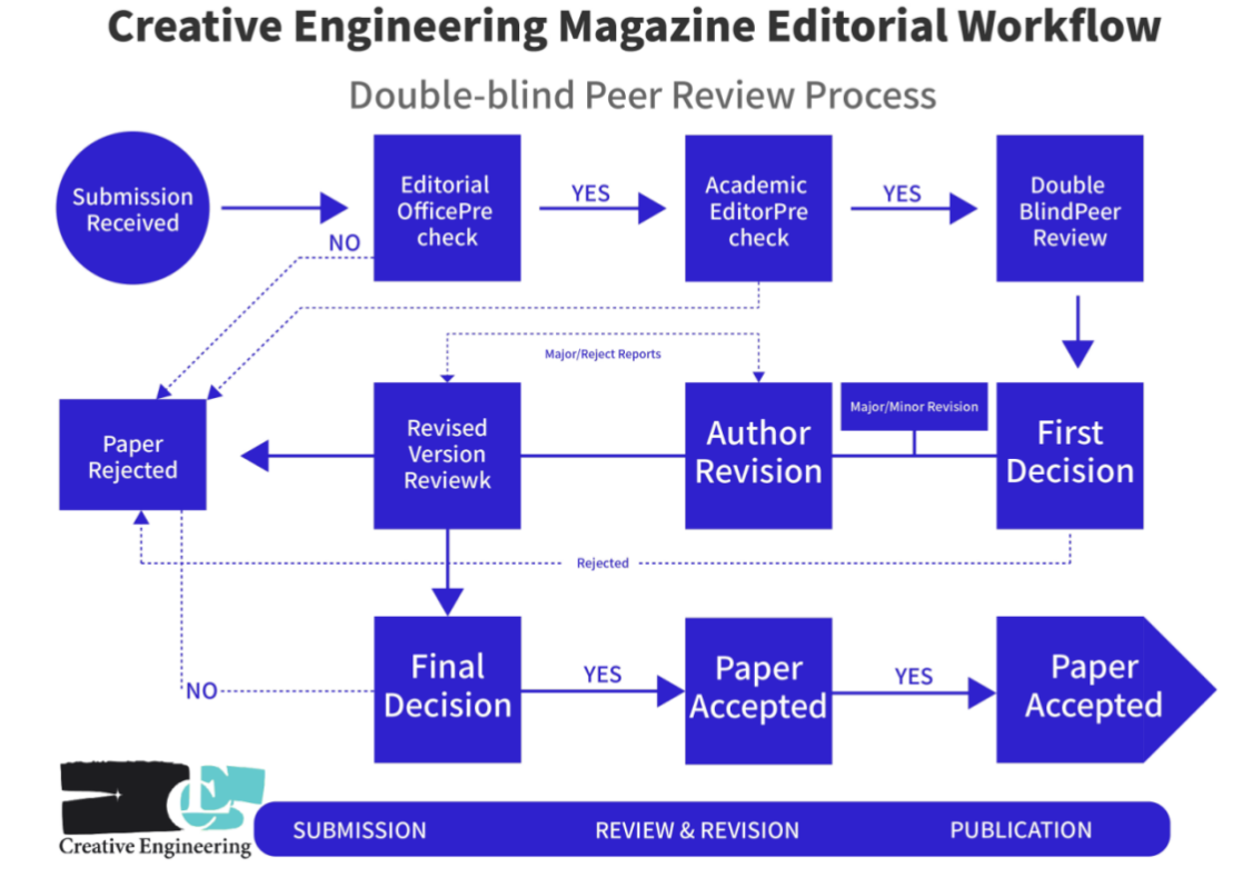 Creative Engineering is committed to upholding high standards of academic quality through a rigorous and transparent double-blind peer review process, jointly managed by researchers and academic editors throughout. To ensure review efficiency, authors are advised to carefully review and adhere to the editorial office's pre-submission checklist before submitting their work, thereby avoiding rejection due to formatting or content non-compliance. All submissions are processed according to the following workflow: